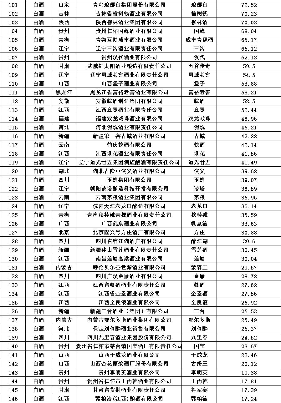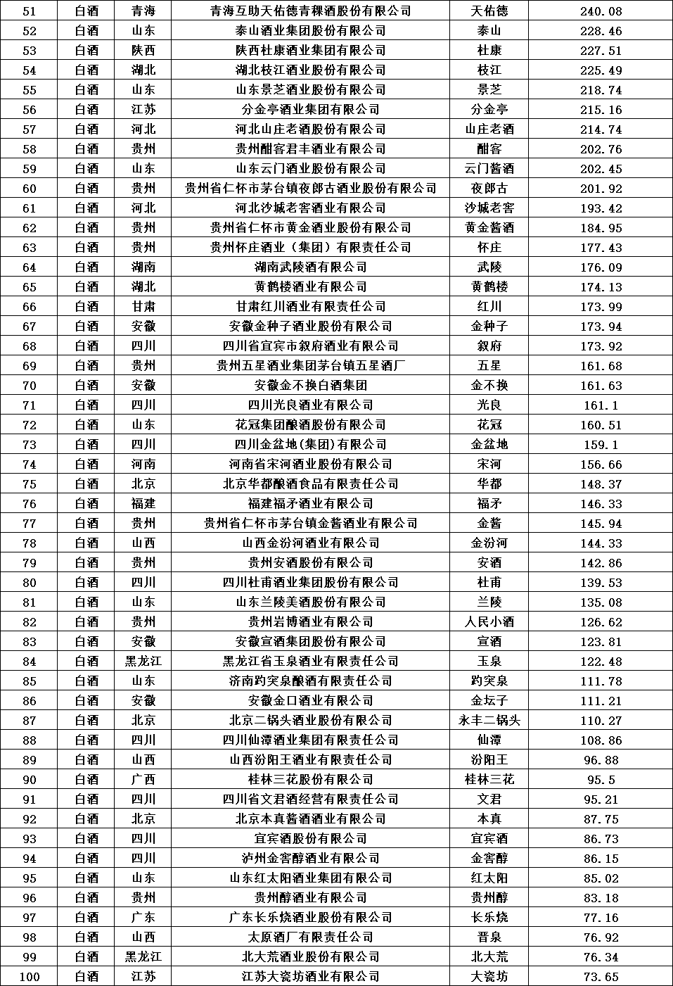 华樽杯第十七届中国酒类品牌价值200名单详细如下: